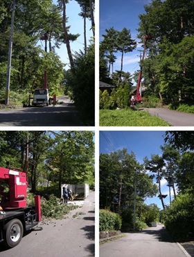 • 他の樹木や電線に倒れて影響を与えないように、上部からの幾度かに分けた伐採。